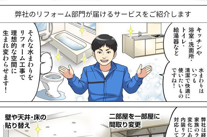 水まわりから内装・外装にいたるまで、幅広いリフォーム工事が可能です。日本住宅設備協会認定の「リフォームスペシャリスト」資格を持ったスタッフによる安心の施工をご提供いたします。